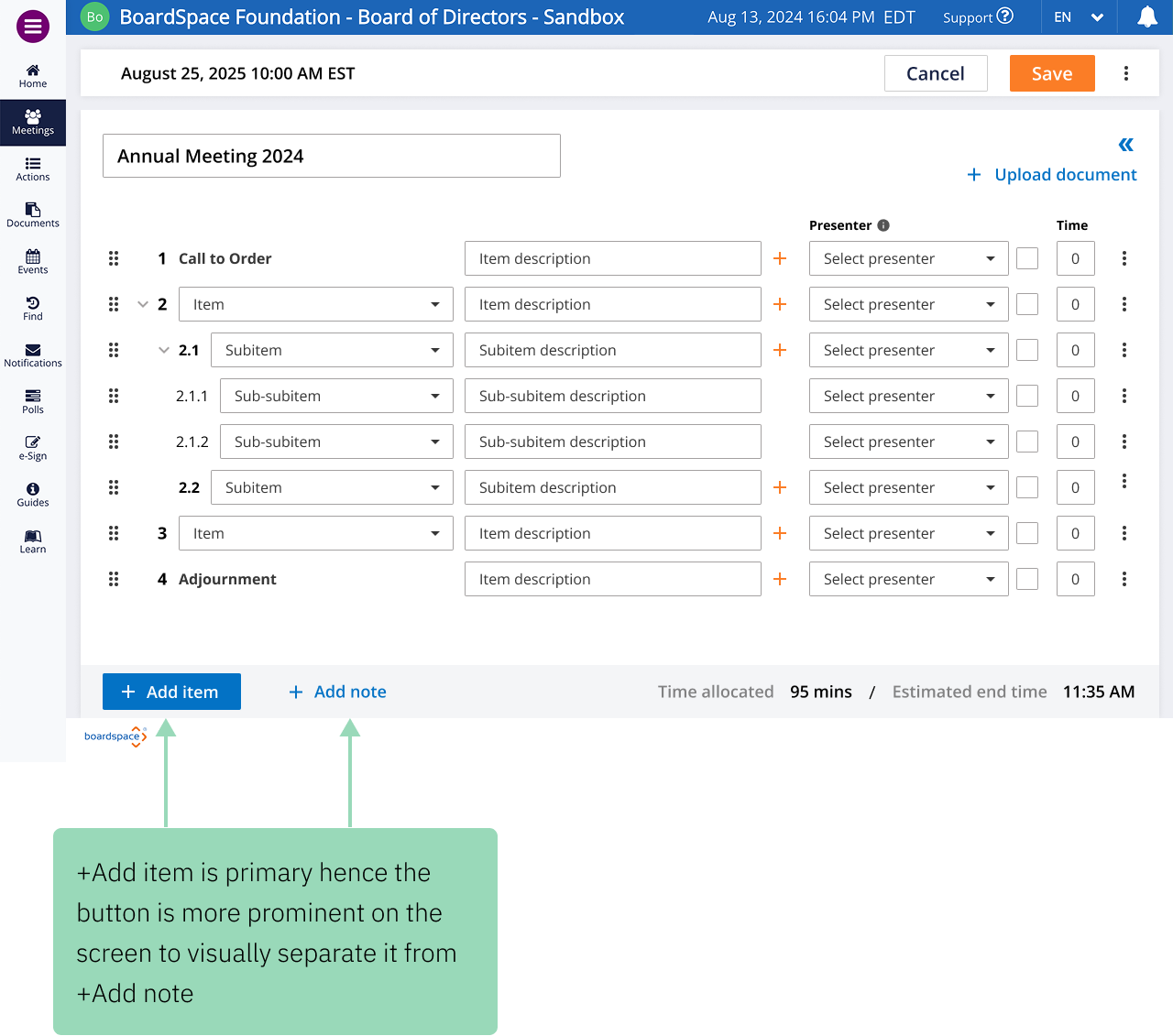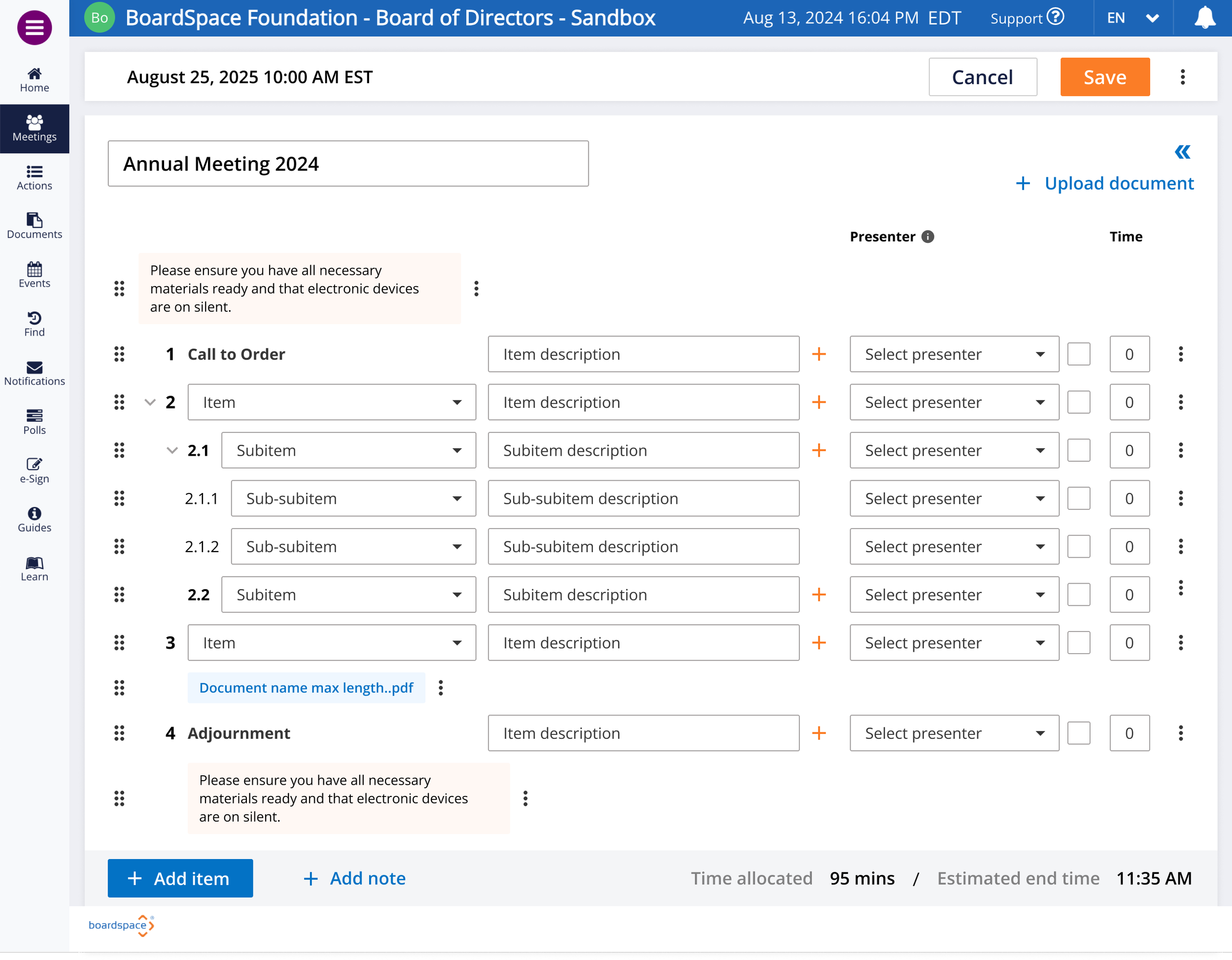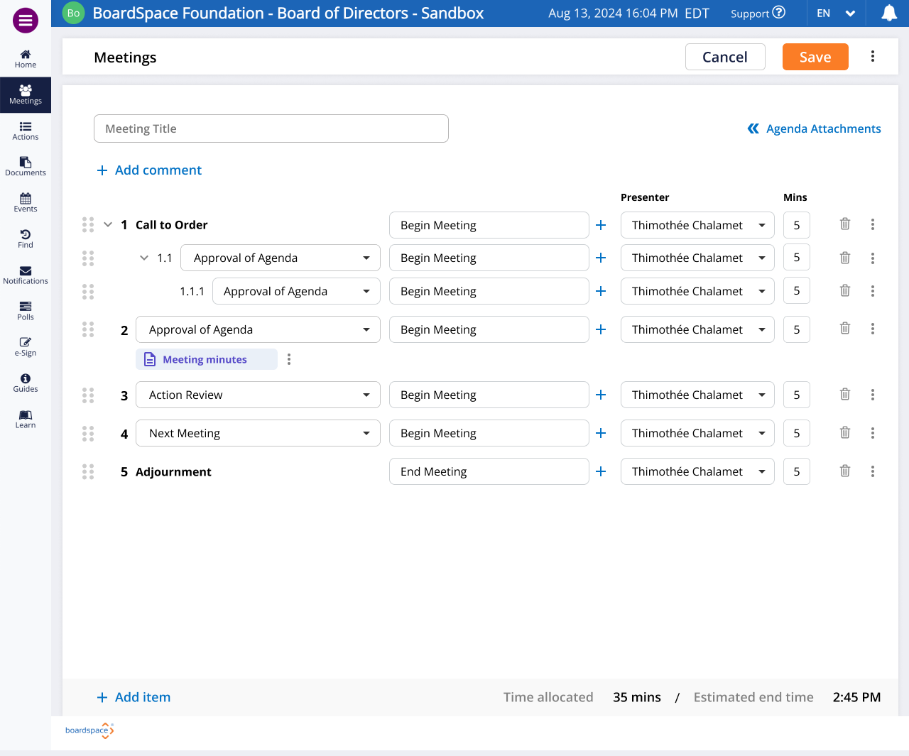 The Agenda Builder Tool allows a designated member of the organization to create and edit a detailed schedule for meetings, including the ability to: