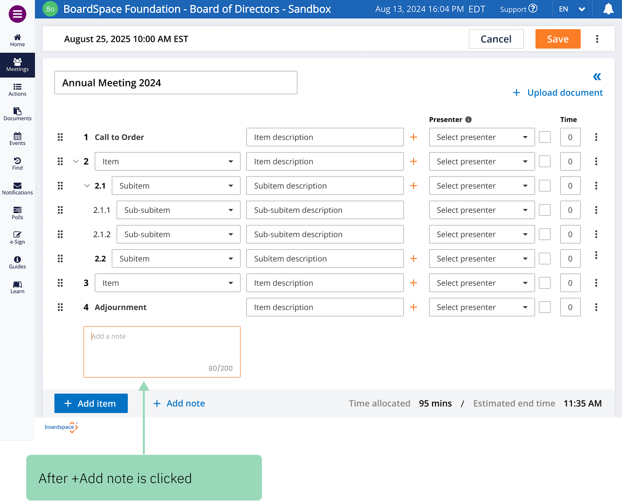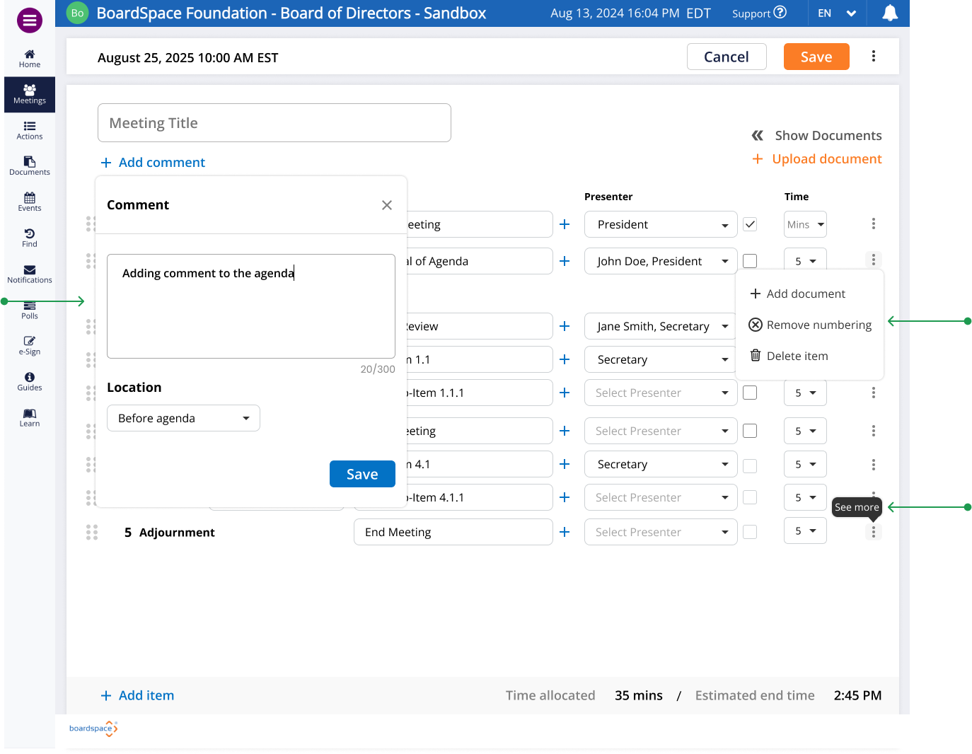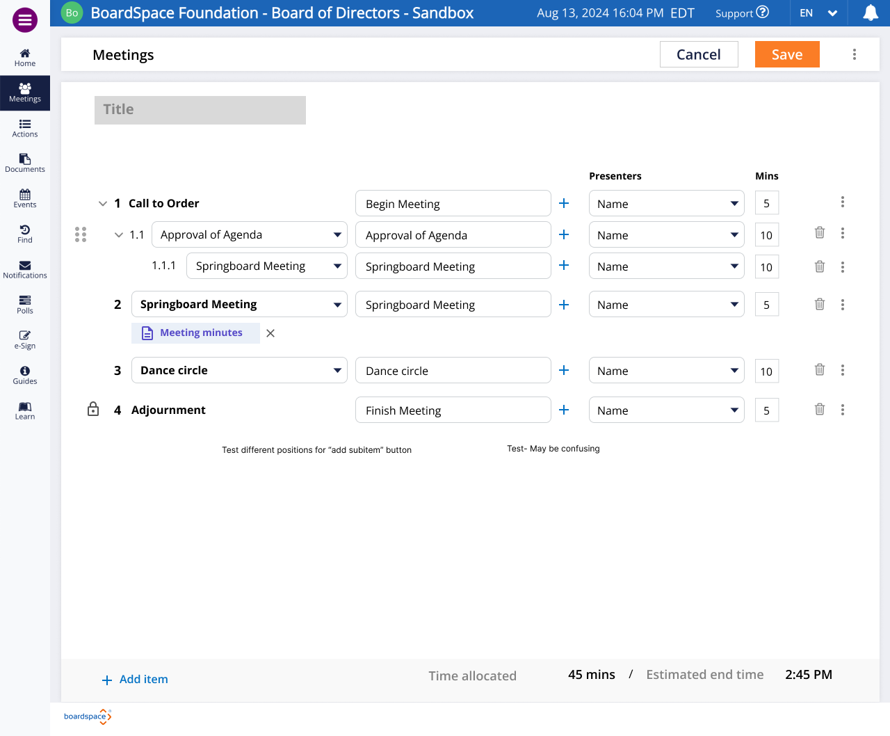 The Agenda Builder Tool allows a designated member of the organization to create and edit a detailed schedule for meetings, including the ability to: