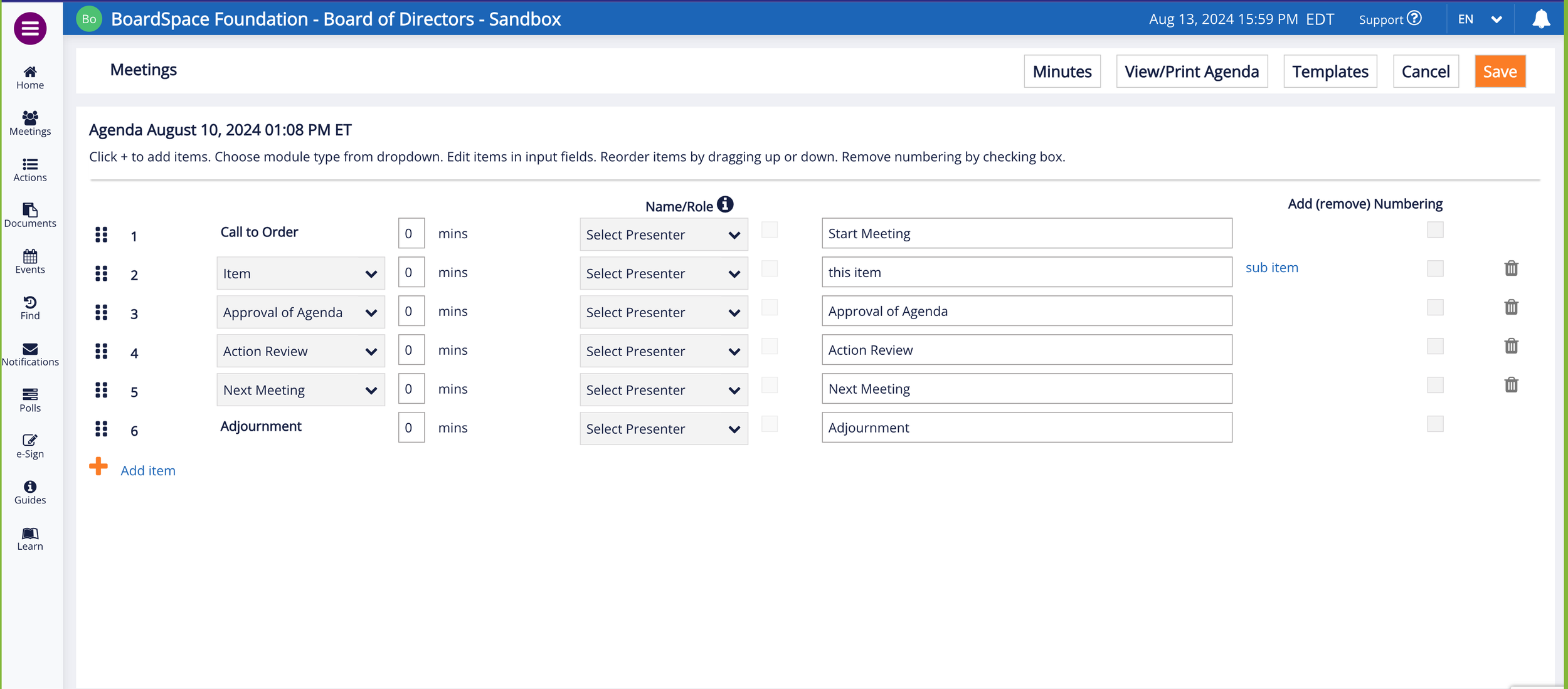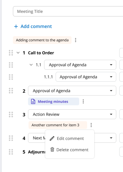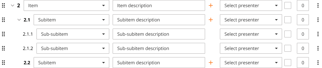 Items should be able to move up, down, and to the sides. For example, item 3 can be indented under item 2 in order to become item 2.1 in the agenda.