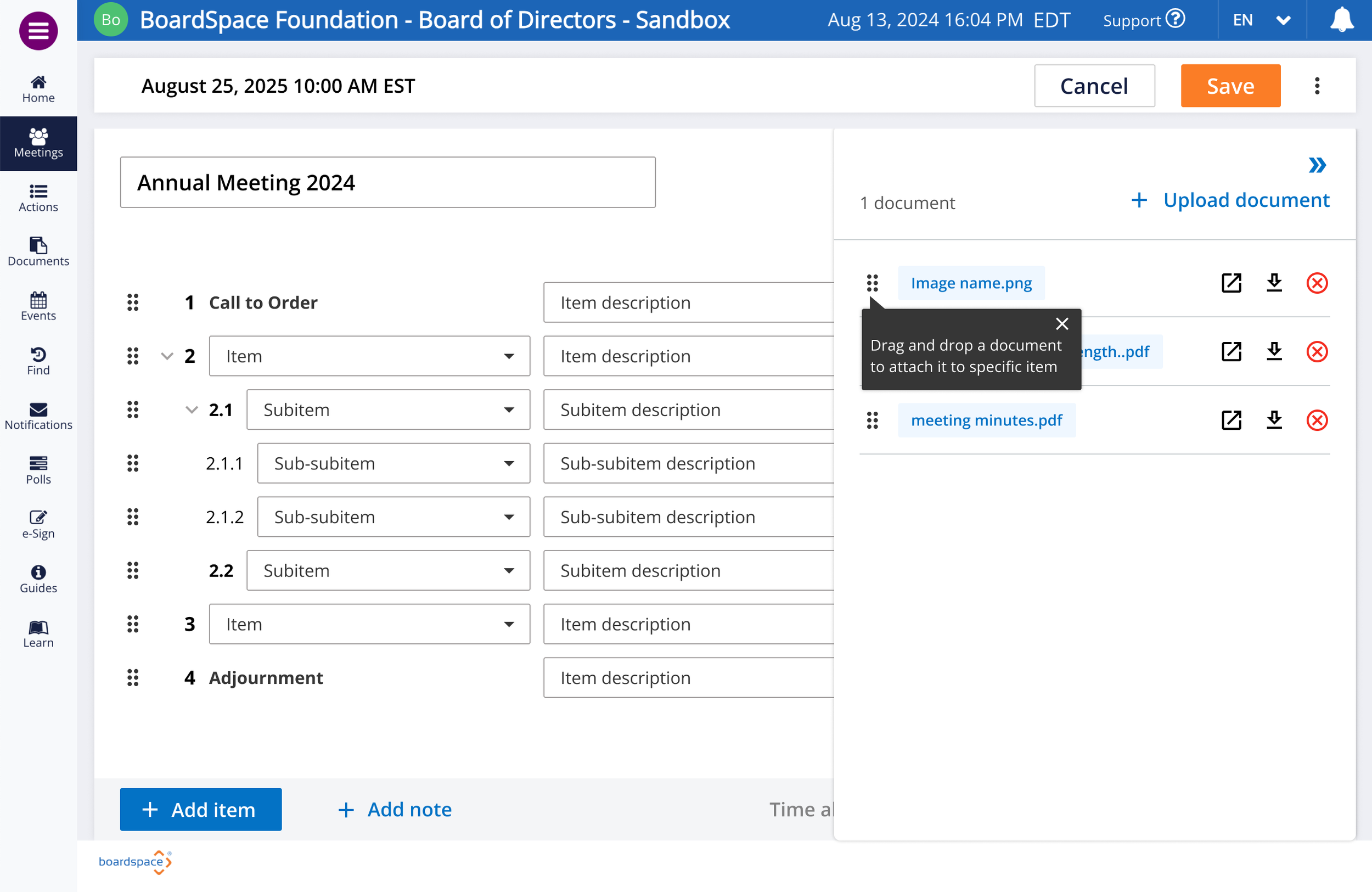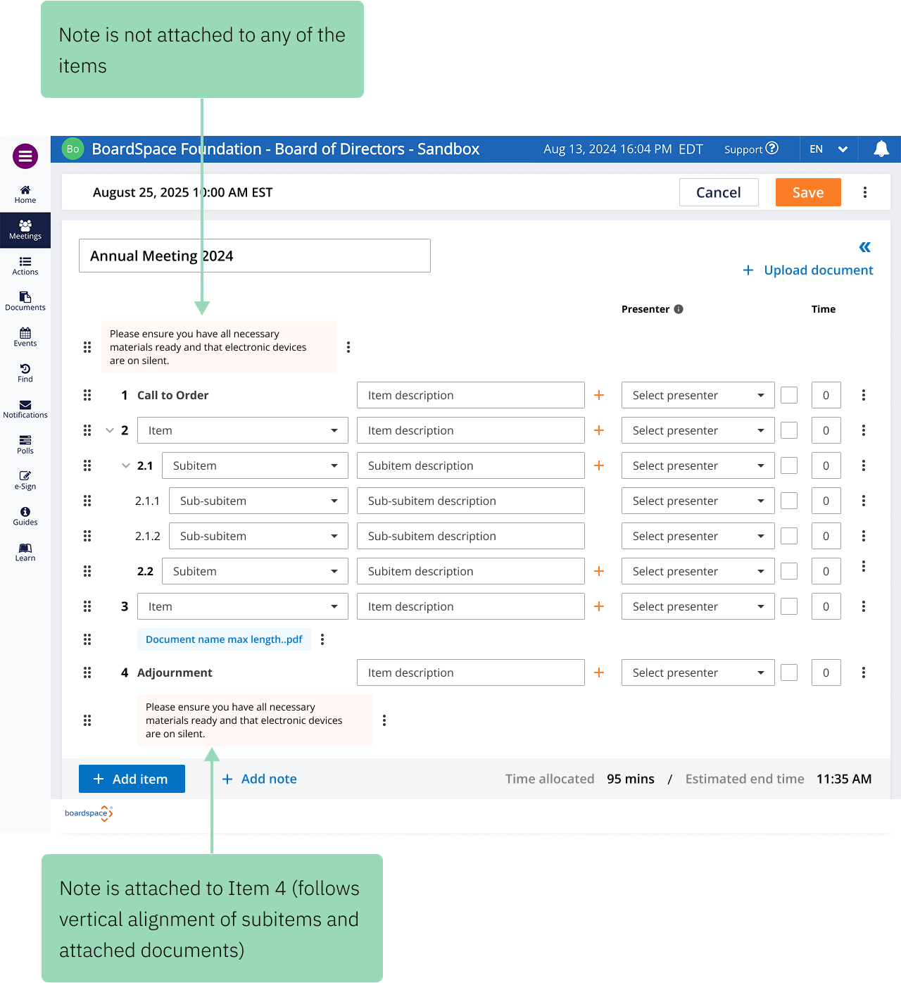 There also needs to be a way for documents to be placed within an item in the agenda.